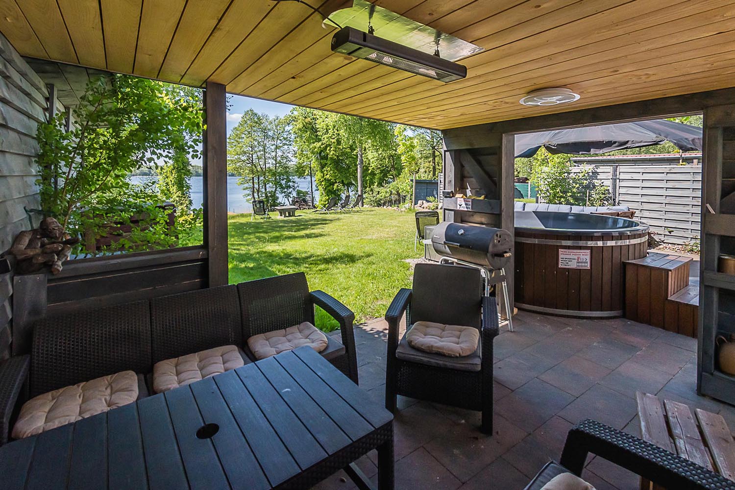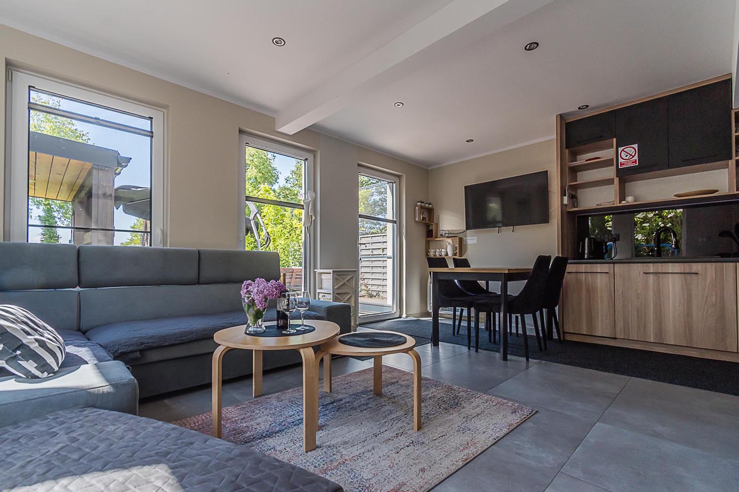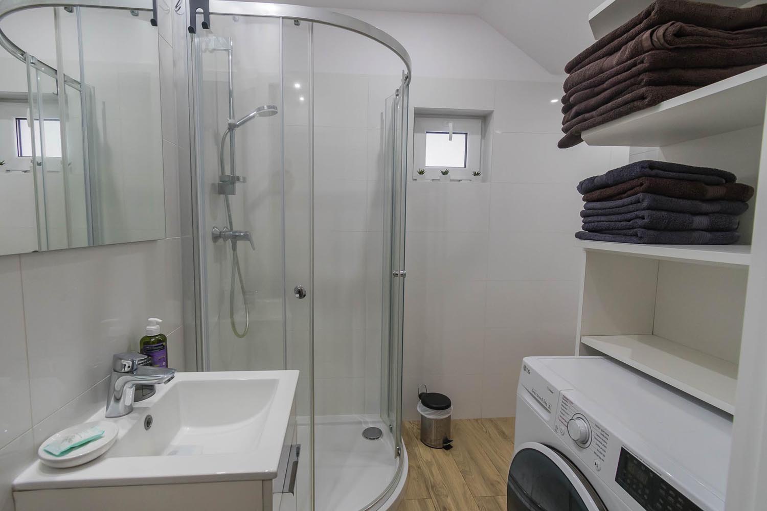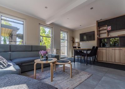 Domki są wyposażone we wszelkie niezbędne do codziennego funkcjonowania sprzęty typu lodówka, pralka, zmywarka, piekarnik. Dodatkowo domek jest klimatyzowany.
